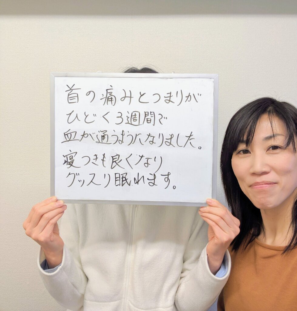 慢性的な首肩の痛み、ベットに入っても2−3時間寝られない等、悩んでいました。