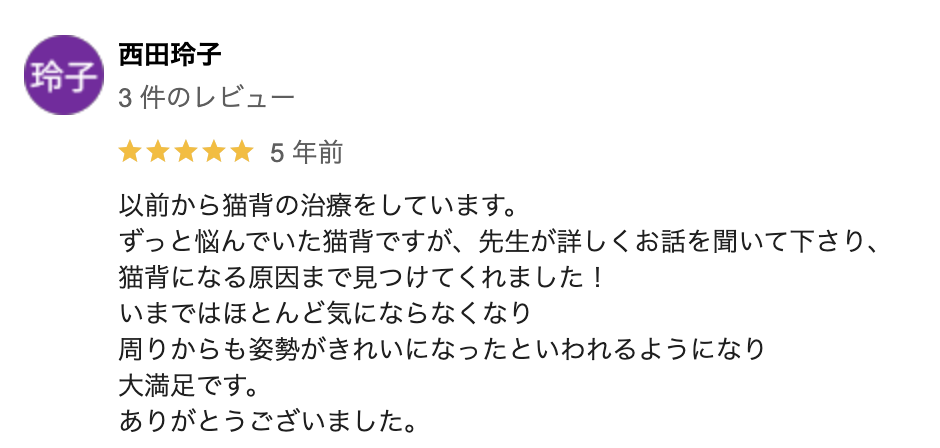 整体のお陰で姿勢もよくなり、肩こりもなくなったのも嬉しかったです。