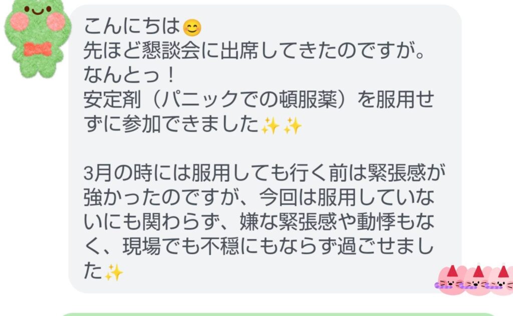 先ほど懇談会に出席してきたのですが。 なんとっ! 安定剤(パニックでの頓服薬)を服用せずに参加できました